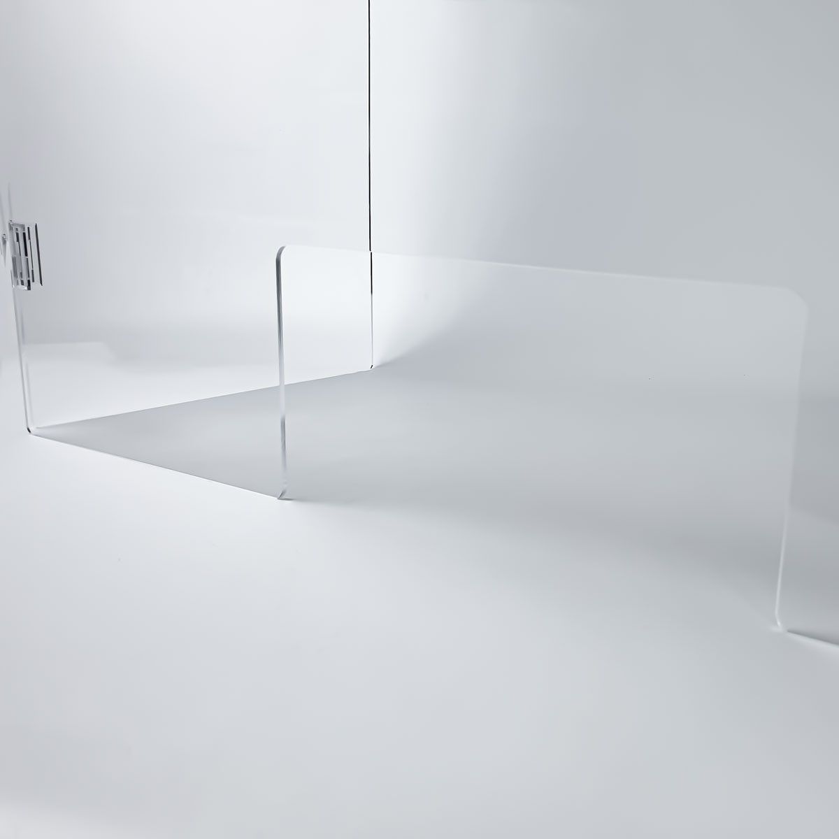 La mampara plegable consta de dos laterales a modo de puertas que se abren a 90º y ya puedes colocarlo sobre tu mesa o mostrador.